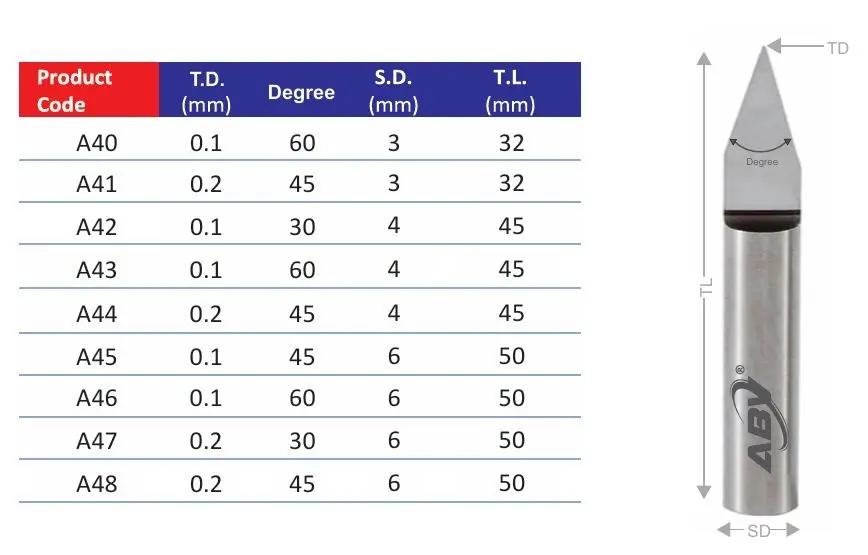 V-Bits (Single Point): Featured in various angles (15°, 20°, 30°, 45°, 60°). The sharper the angle (15°), the finer the line.