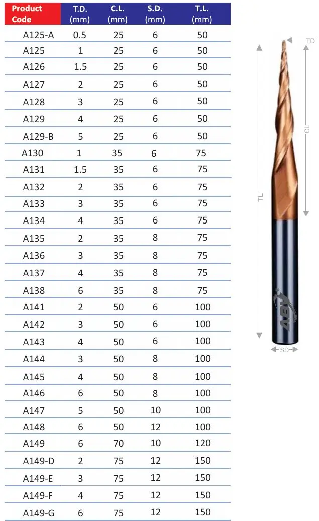 Standard ball nose bits are prone to snapping when the tip gets smaller than 3mm because the shank is thin. The Tapered design solves this:
